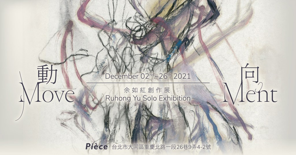 本次展覽「Move-Ment 動-向」,透過觀察人體的連續性與序列動作,以畫筆,甚至徒手抓取顏料、塗抹基底,在畫布留下不同物體和材質接觸的痕跡。看似隨機、毫無章法,卻又保有一定流向與連動性,如同無法觸及的時間與「移動」的證明。每一副畫都像殘影或不完整的殘體,猶如處於變動時代的我們,現代/傳統、網路/現實、疫情/死亡⋯⋯在「虛」與「實」之間,以最真實的「動」親身見證一切。