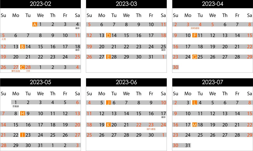 - 申請者須提出兩個時段需求,並以下圖所示之時段(A~M)選擇,以便安排展覽排程。若有特殊使用需求請提出,將另行安排討論。
