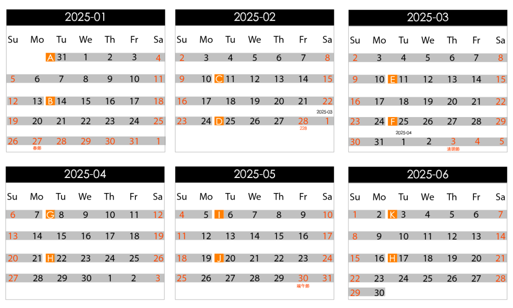 以2週(14天)為時段單位,至多不超過8週。時段包含佈撤展,佈撤展時間建議為非空間開放時間(周一至周三)。空間不包含顧展人員,需自行安排顧展。申請者須提出3個時段需求順位,並以下圖所示之時段(A~H)選擇,以便安排展覽排程。若有特殊使用需求請提出,將另行安排討論。- 空間建議開放時間為周四至周日14:00~19:00,若需開放其他時段也請提前告知說明。