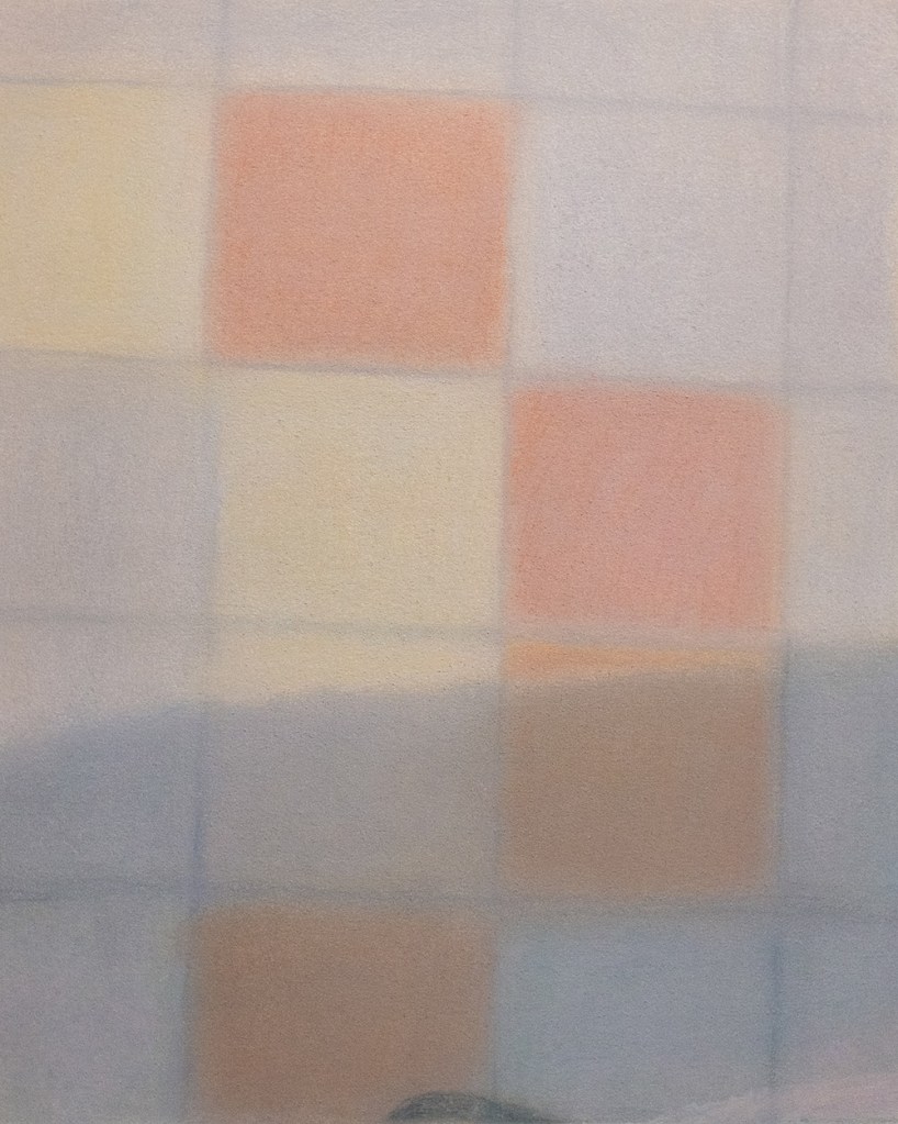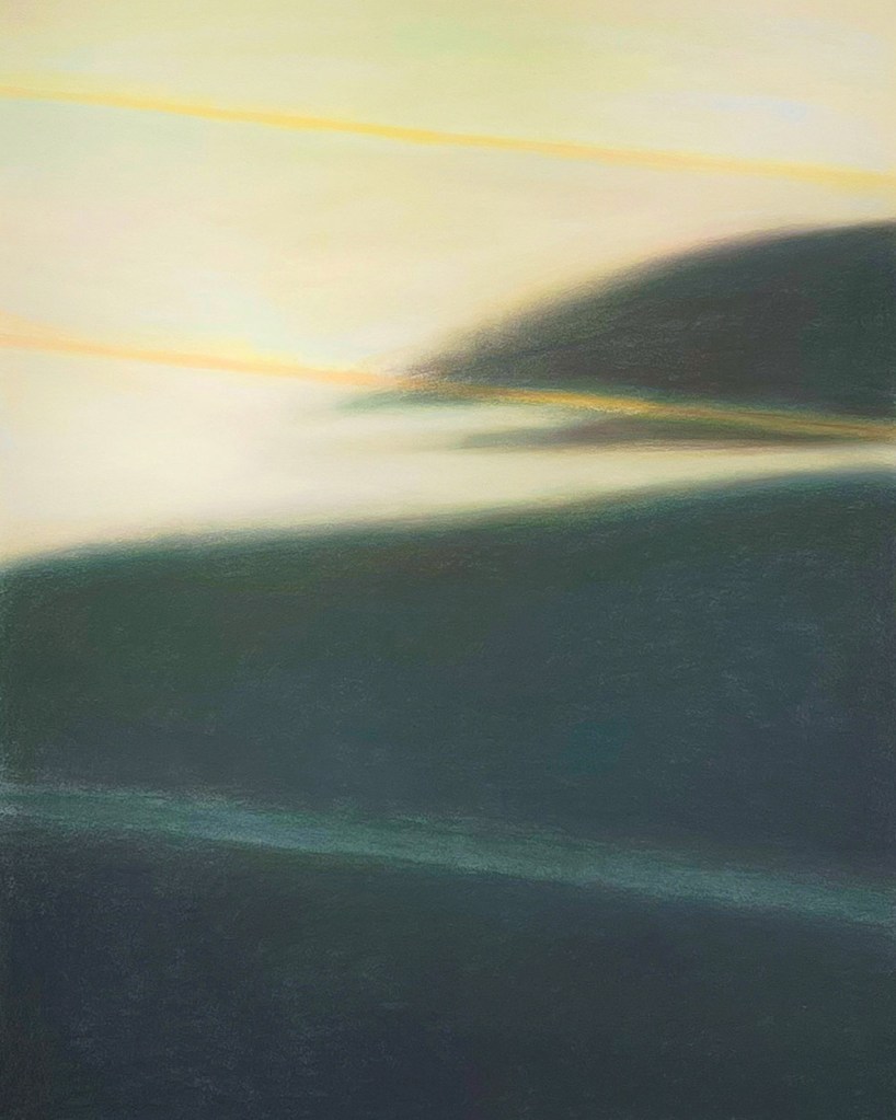 乾粉彩作為一種溫潤且柔軟的材質,透過手反覆塗抹,如粉塵般依附在紙上,層層交疊的色粉產生曖昧的觸感,事物的邊界彼此消融,變成私密的絮語。風景被裁切和放大,有別於傳統意義上風景畫的地理景觀,刪去人物、可供辨識的地標,微觀把地方敞開,簡化為純粹的線條和形狀,成為內在景觀的投射物。